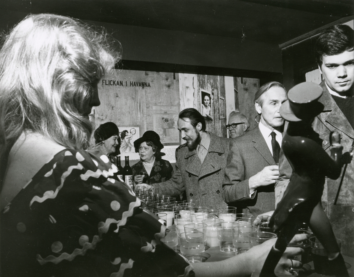 Vernissage för utställningen "Hans namn var Frithiof Andersson om Evert Taube". Personalen serverar dricka vid en bardisk som är en del av utställningen.