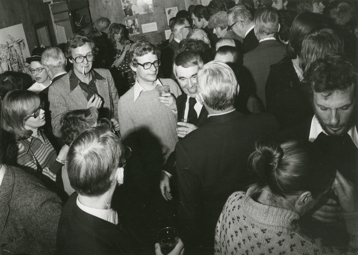 Vernissage för utställningen "Hans namn var Frithiof Andersson om Evert Taube". Fullt med besökare i lokalen.