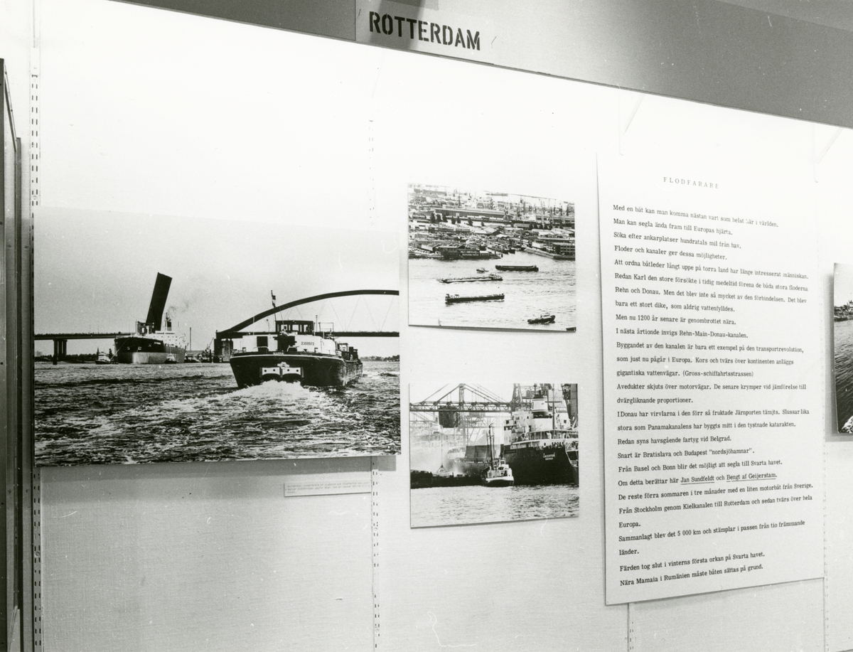 Utställningen "Flodfarare". Utställningsskärm med bilder från Rotterdam samt en text om att resa på floden.