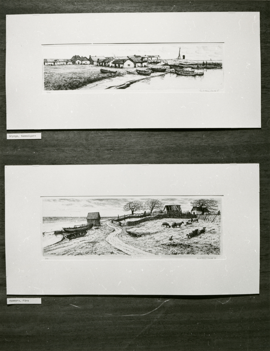 Gotlandsfiskaren och hans tre männing, konstnären Erik Olsson Sanda berättar. Konstverk föreställande Gotländska fiskelägeGryne, Gammelgarn och Hammars, Fårö.