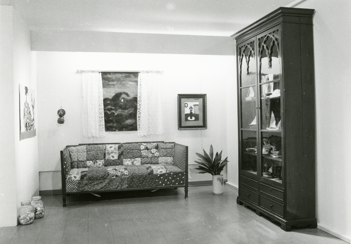 Titel: Utställningen "Havet och Viksjöskolan". Överblick av utställningsinteriör med alster från Viksjöskolan.