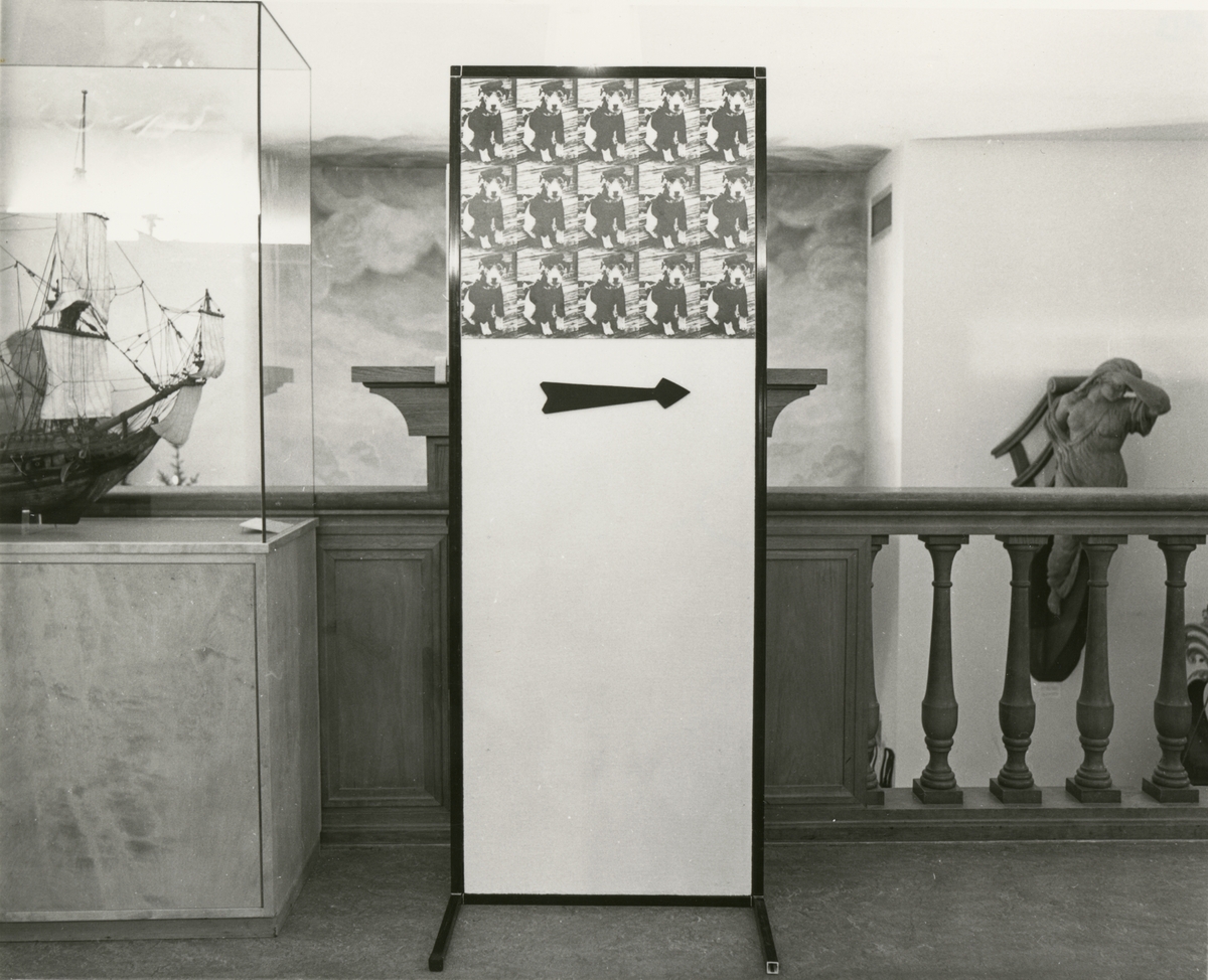 Utställningen "Från predikstol till vindstrut". Riktvisare till utställningen med bild av skeppshunden Nicke.
