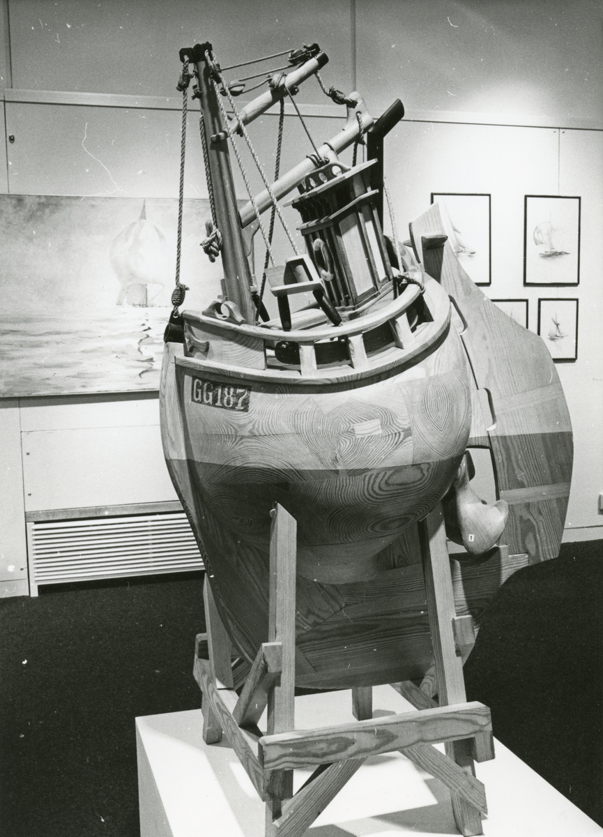 Titel: Utställningen "Så ser vi på båtar". Utställning med fantasiskulpterade fartygsmodeller och konst.