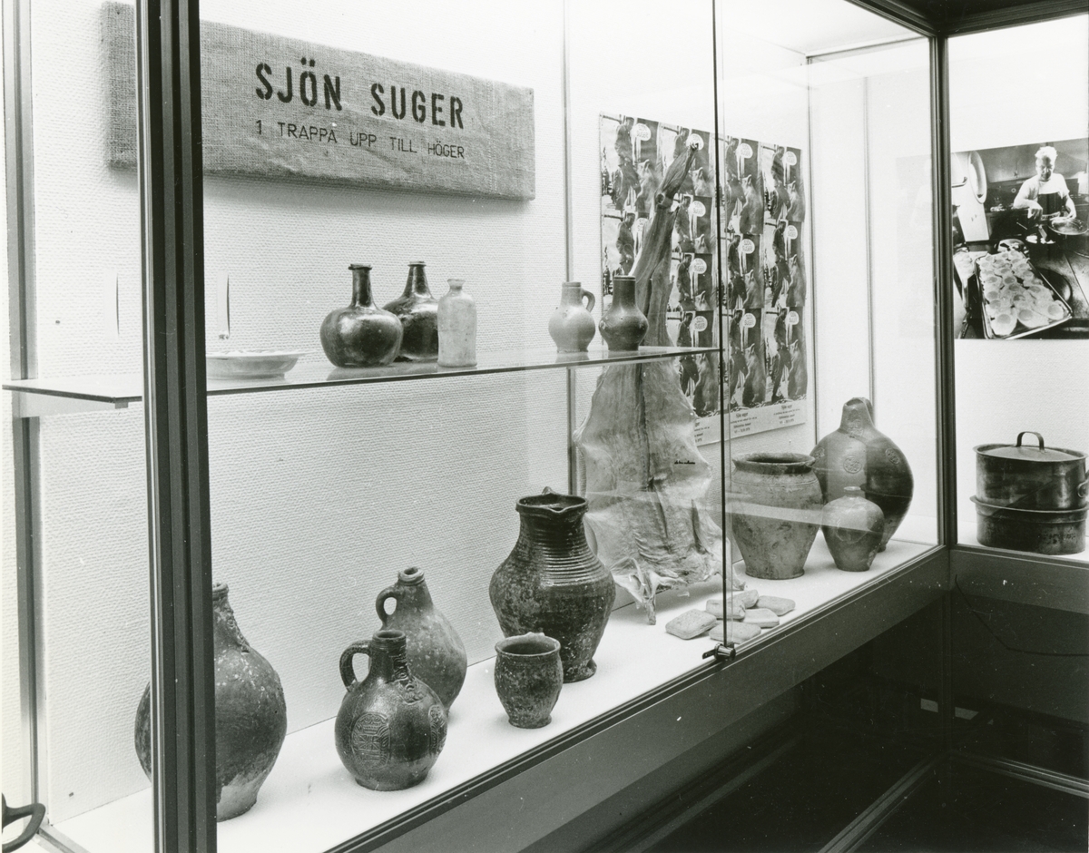 Utställningen "Sjön suger". Utställning om mathållningen inom sjöfarten. Föremål med mataknytning i trappmontern.