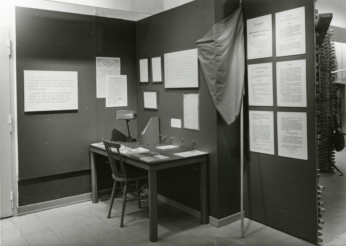 Utställningen "Kvinnor i hamn". Utställningsinteriör liknade ett hamnkontor med fördjupningslitteratur.