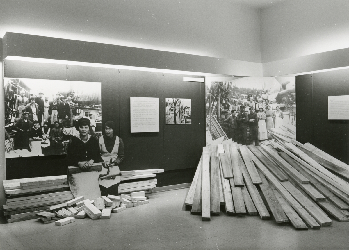 Utställningen "Kvinnor i hamn". Utställningsinteriör med hamnarbetare och lossning/lastning av virke.