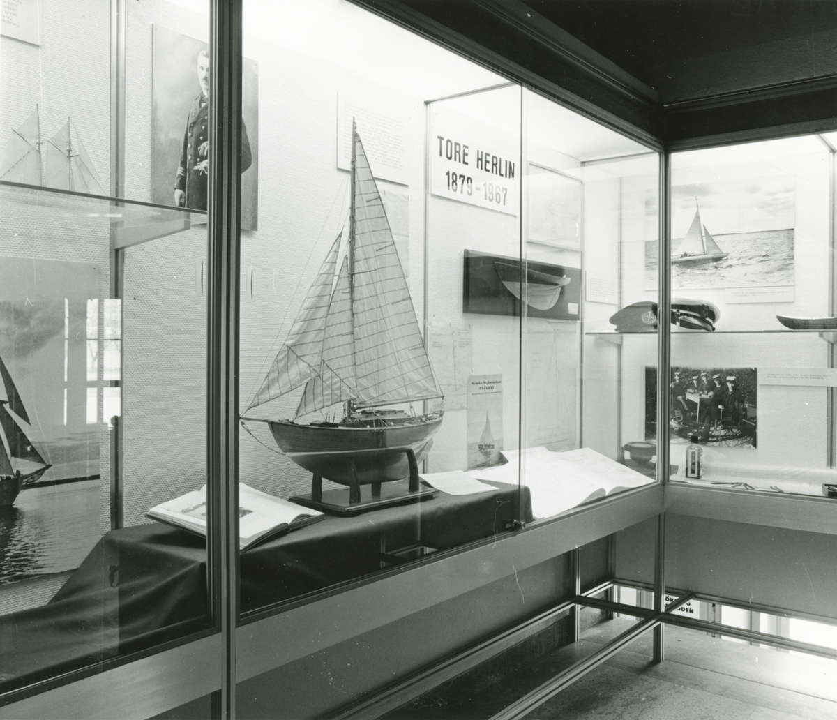 Utställningen "Tore Herlin" i trappmonter. Presentation av Tore Herlin med bl.a. fotografier och fartygsmodeller.