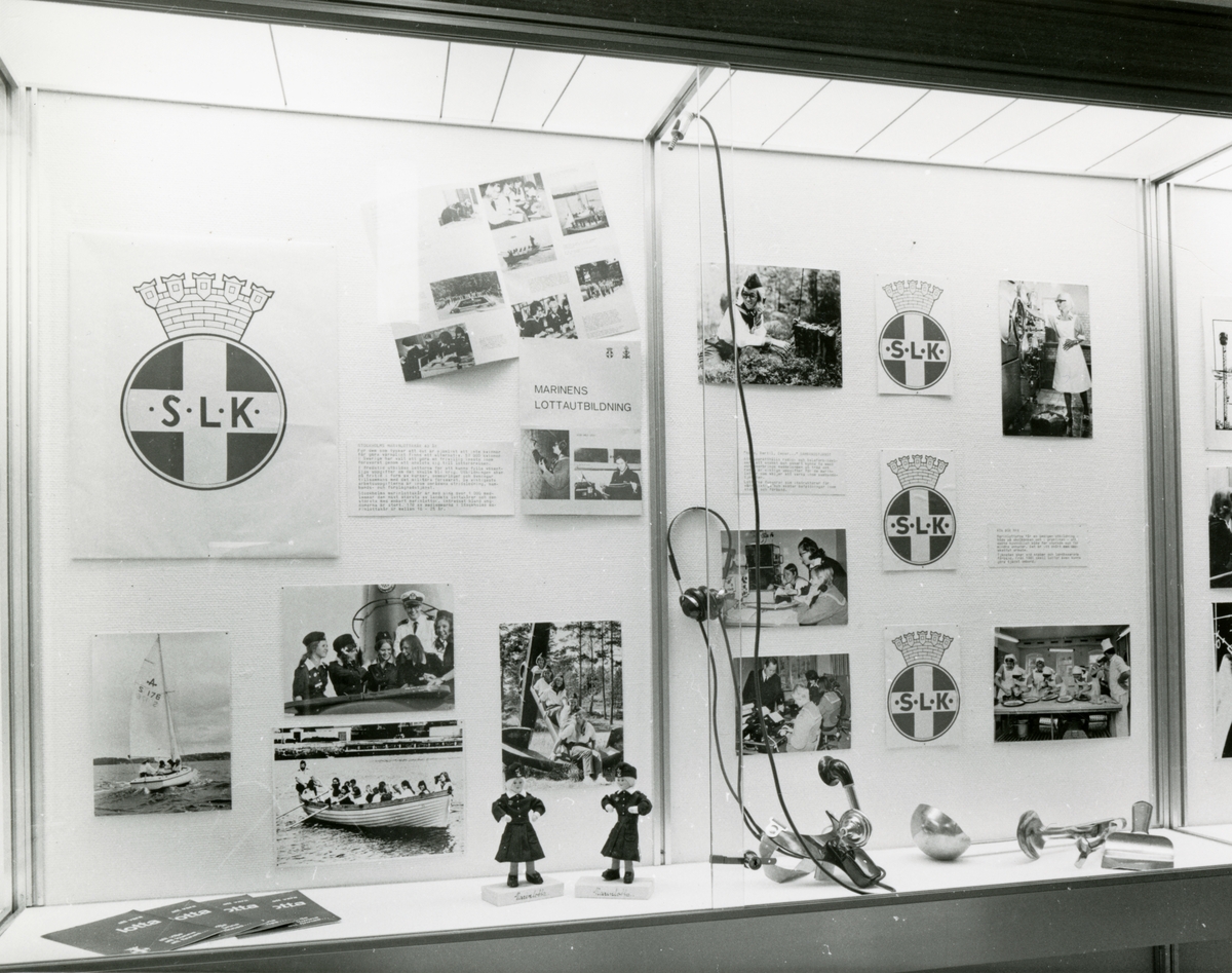 Utställningen "Marinlottakåren 19391979". Del av trappmontern med fotografier och föremål.