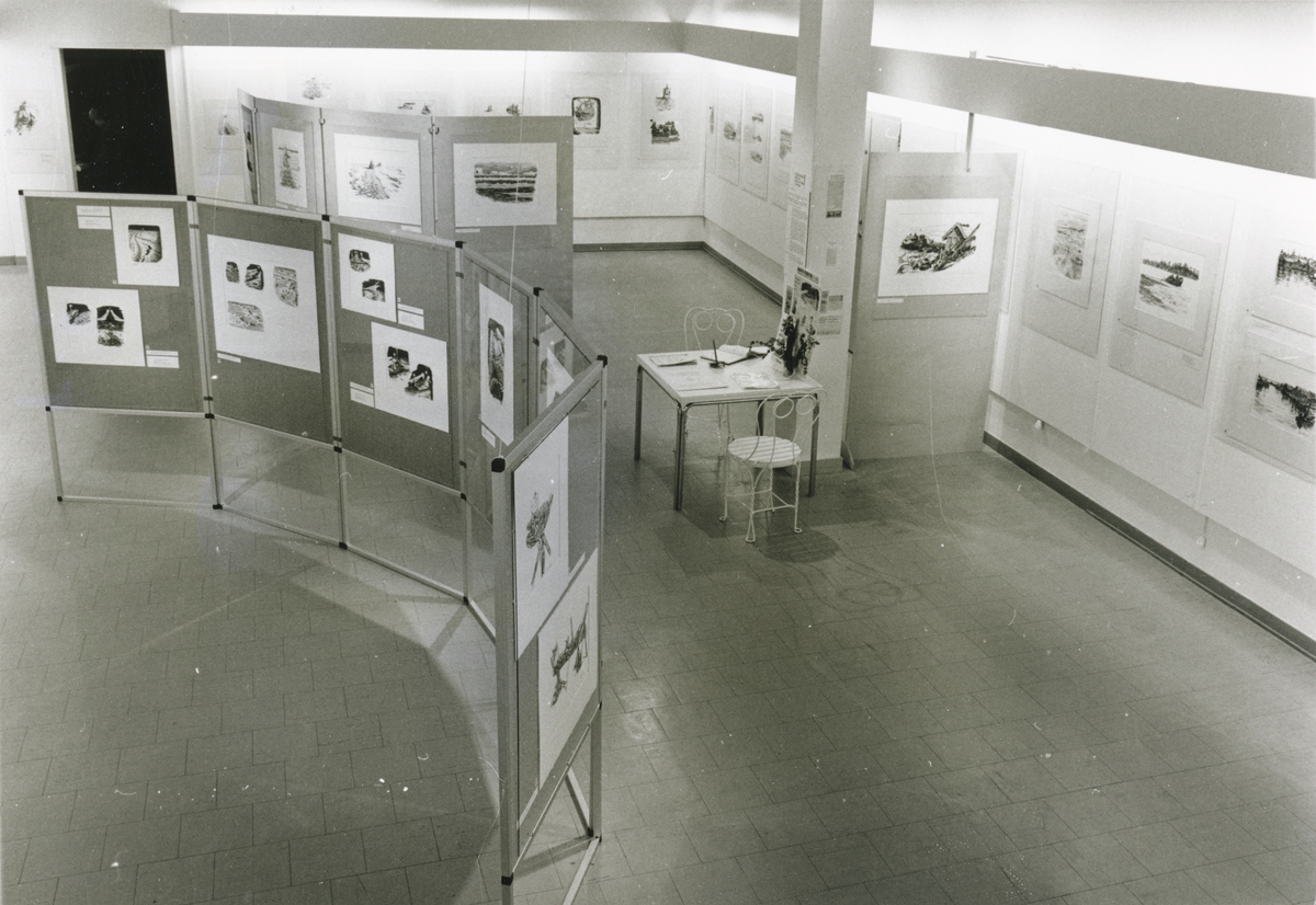 Utställningen "Is, kust, båtar, fartyg". Överblick av utställningsinteriör med teckningar.