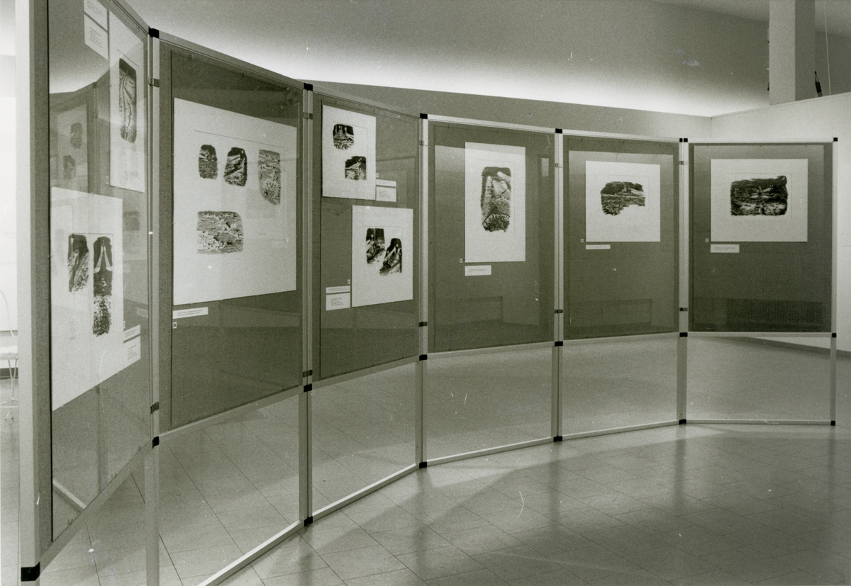 Utställningen "Is, kust, båtar, fartyg". Utställningsinteriör med teckningar.