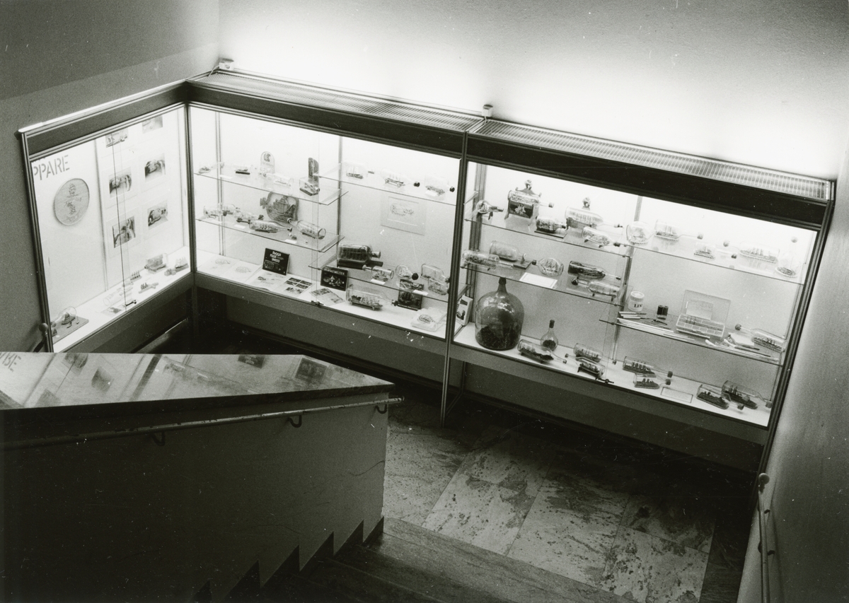 Utställningen "Flaskskeppare". Översikt av trappmonter med flaskskepp av varierande slag.