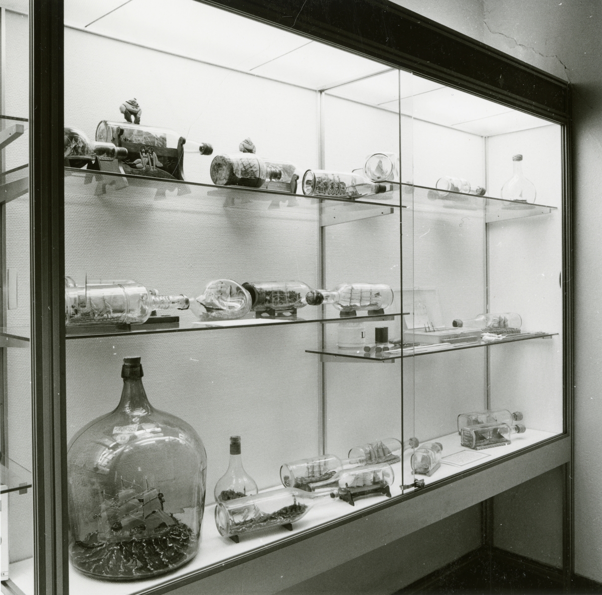Utställningen "Flaskskeppare". Del av trappmonter med flaskskepp av varierande slag.