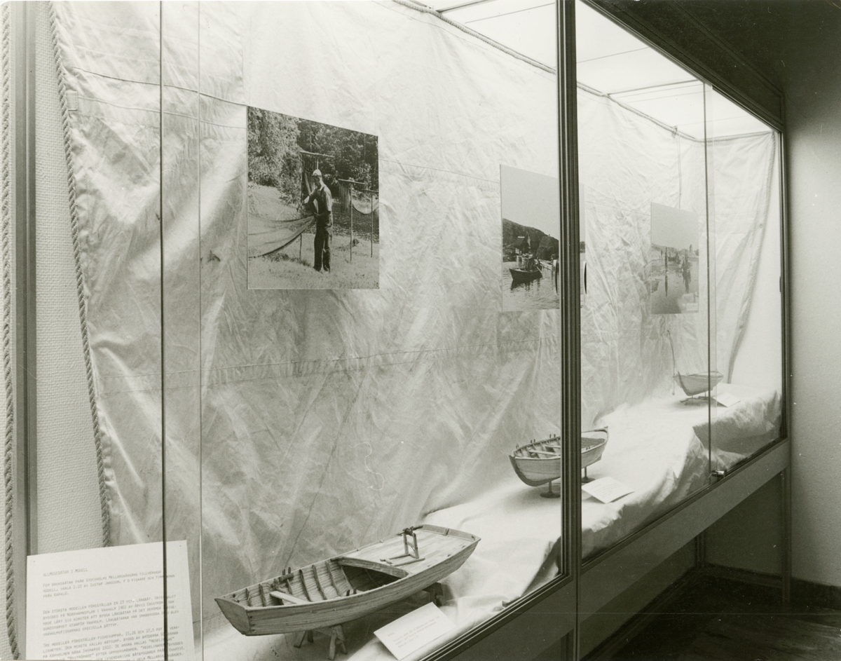 Utställningen "Allmogebåtar i modell". Del av trappmontern med fartygsmodeller och fotografier.