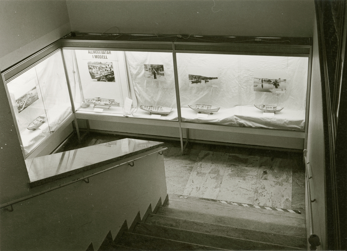 Utställningen "Allmogebåtar i modell". Översikt av trappmontern med fartygsmodeller och fotografier.