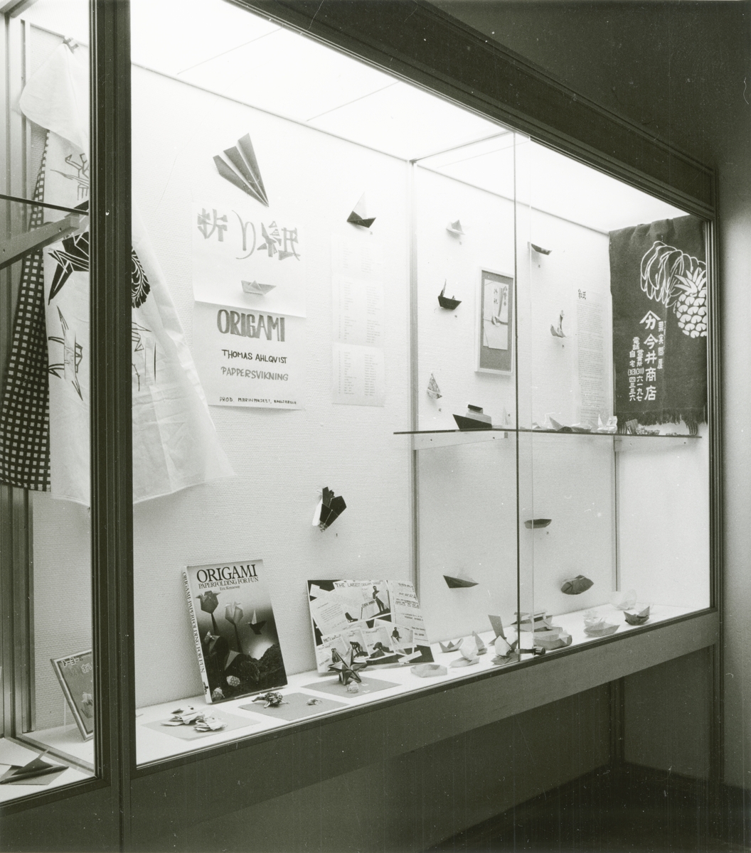 Titel: Utställningen "Origami". Del av trappmonter med pappersvikta figurer och båtar av Thomas Ahlqvist.