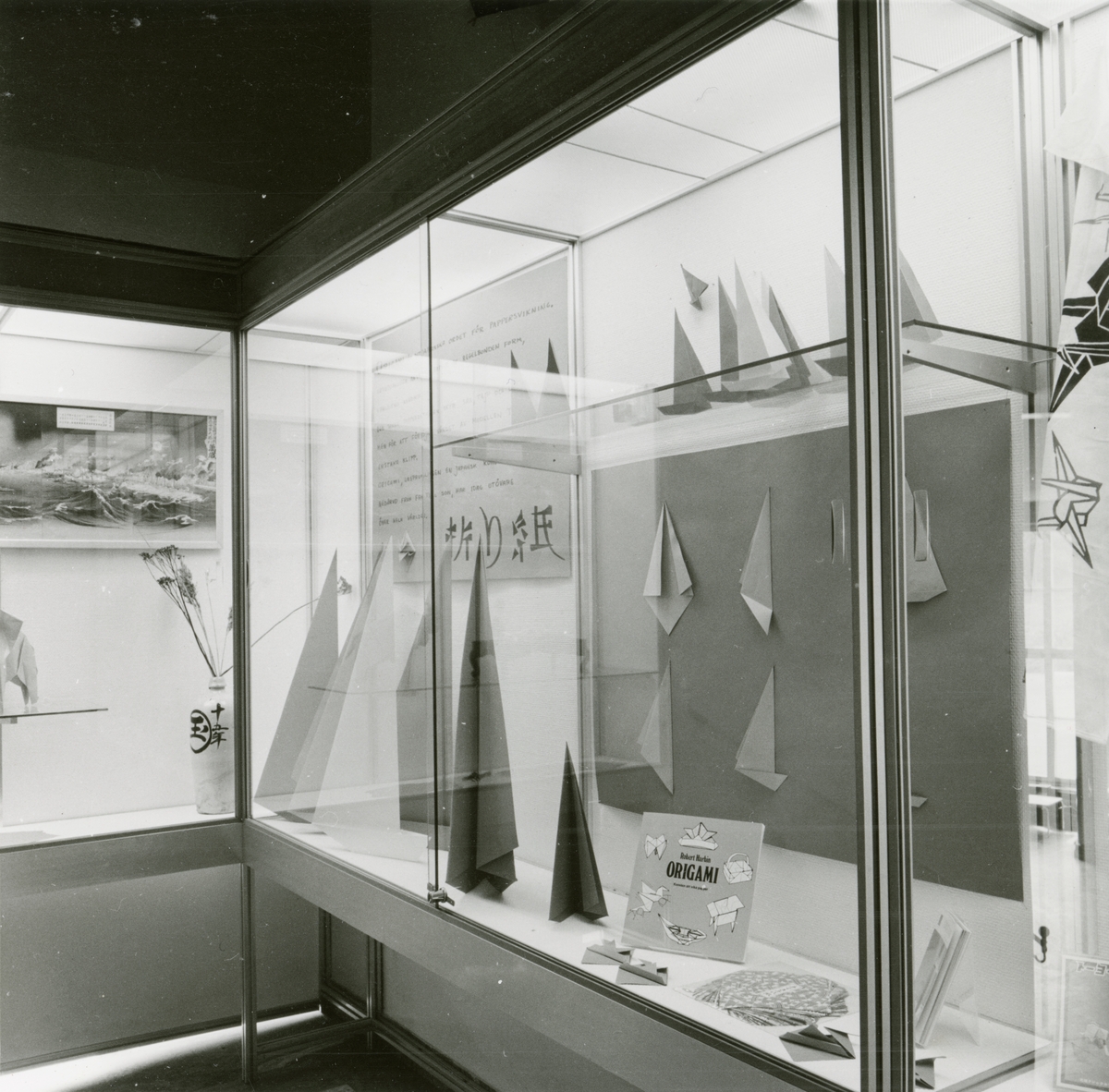 Utställningen "Origami". Del av trappmonter med pappersvikta figurer och båtar av Thomas Ahlqvist.