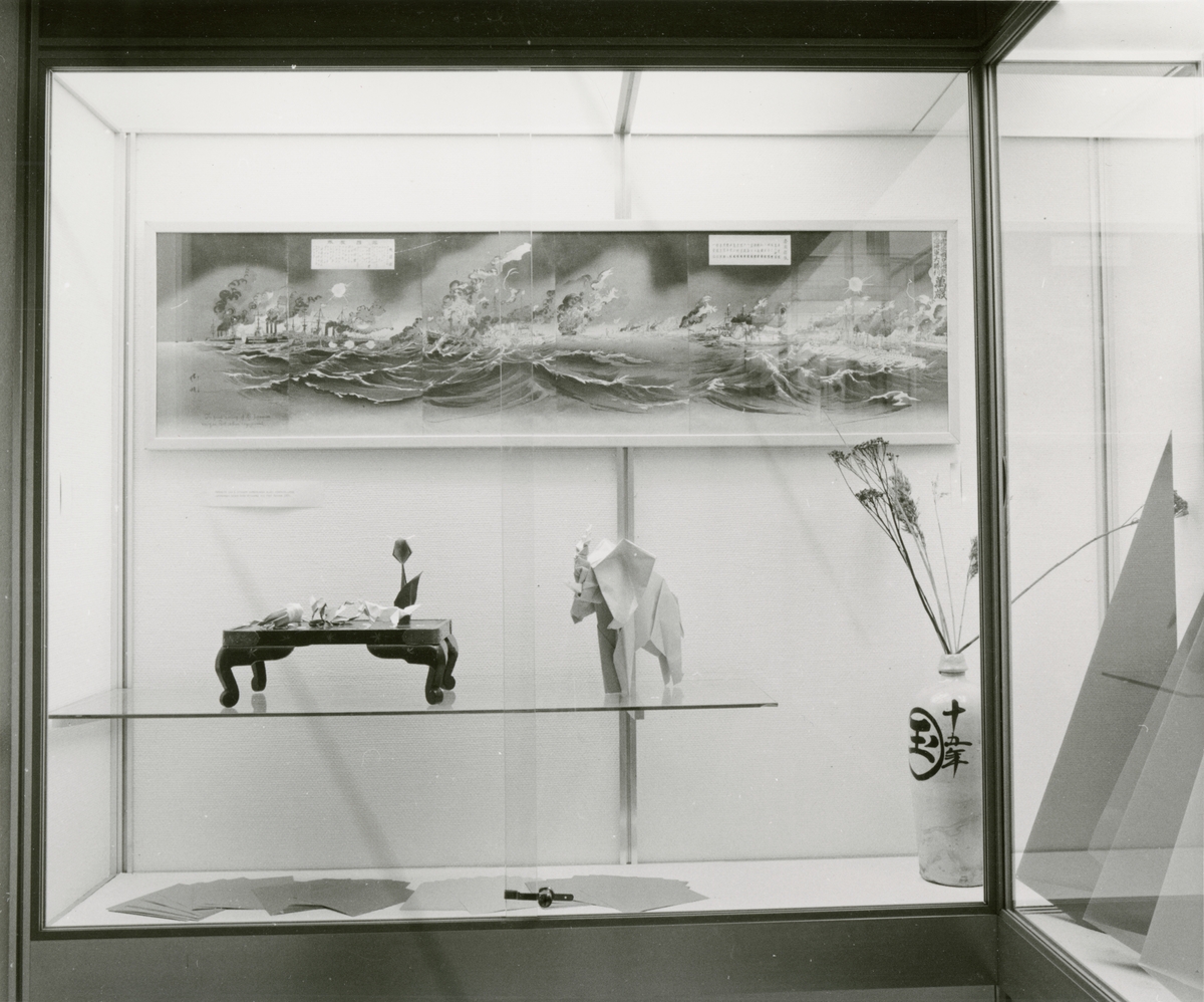 Utställningen "Origami". Del av trappmonter med pappersvikta figurer och båtar av Thomas Ahlqvist.