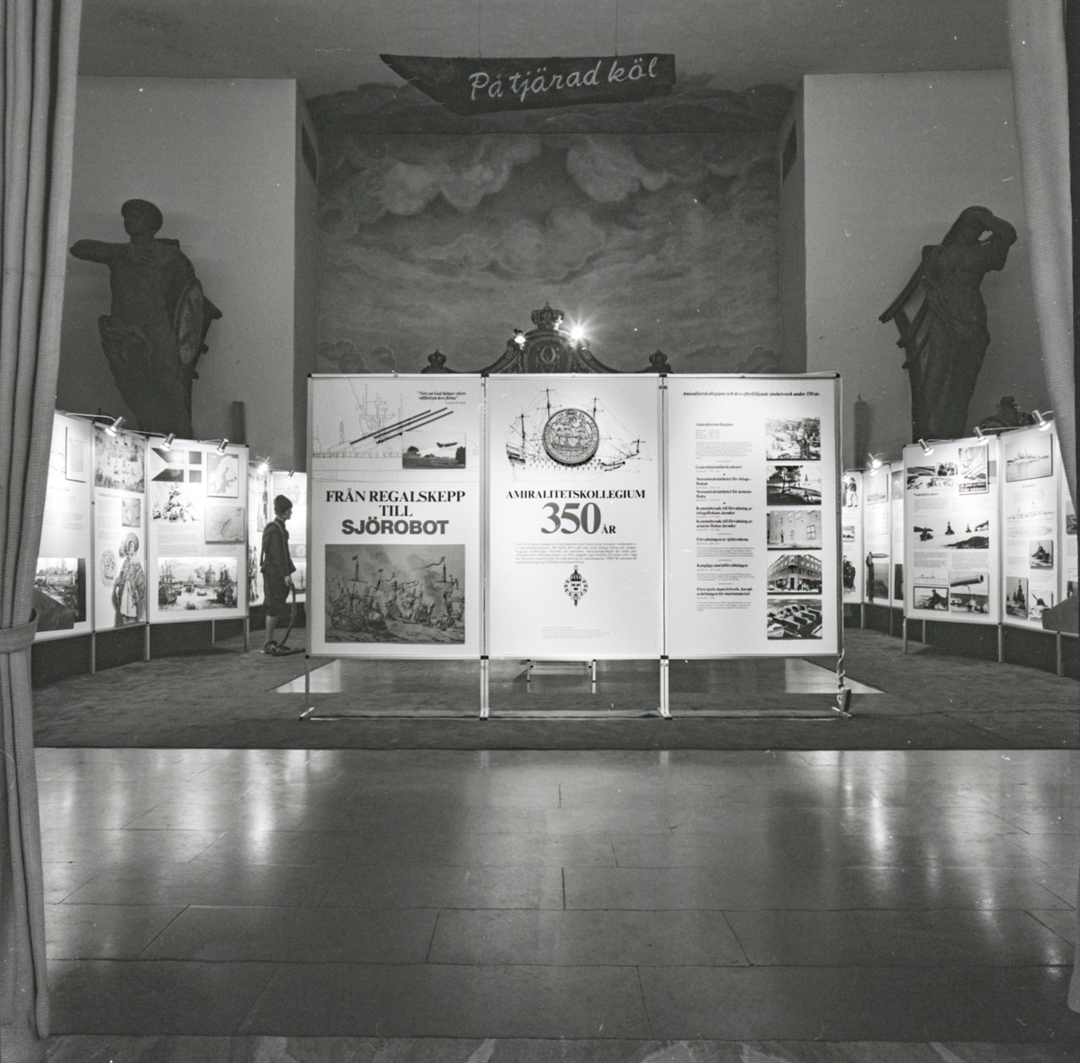 Utställningen "Från regalskepp till sjörobot Amiralitetskollegium 350 år". "På tjärad köl". Överblick av skärmutställning i Minneshallen.