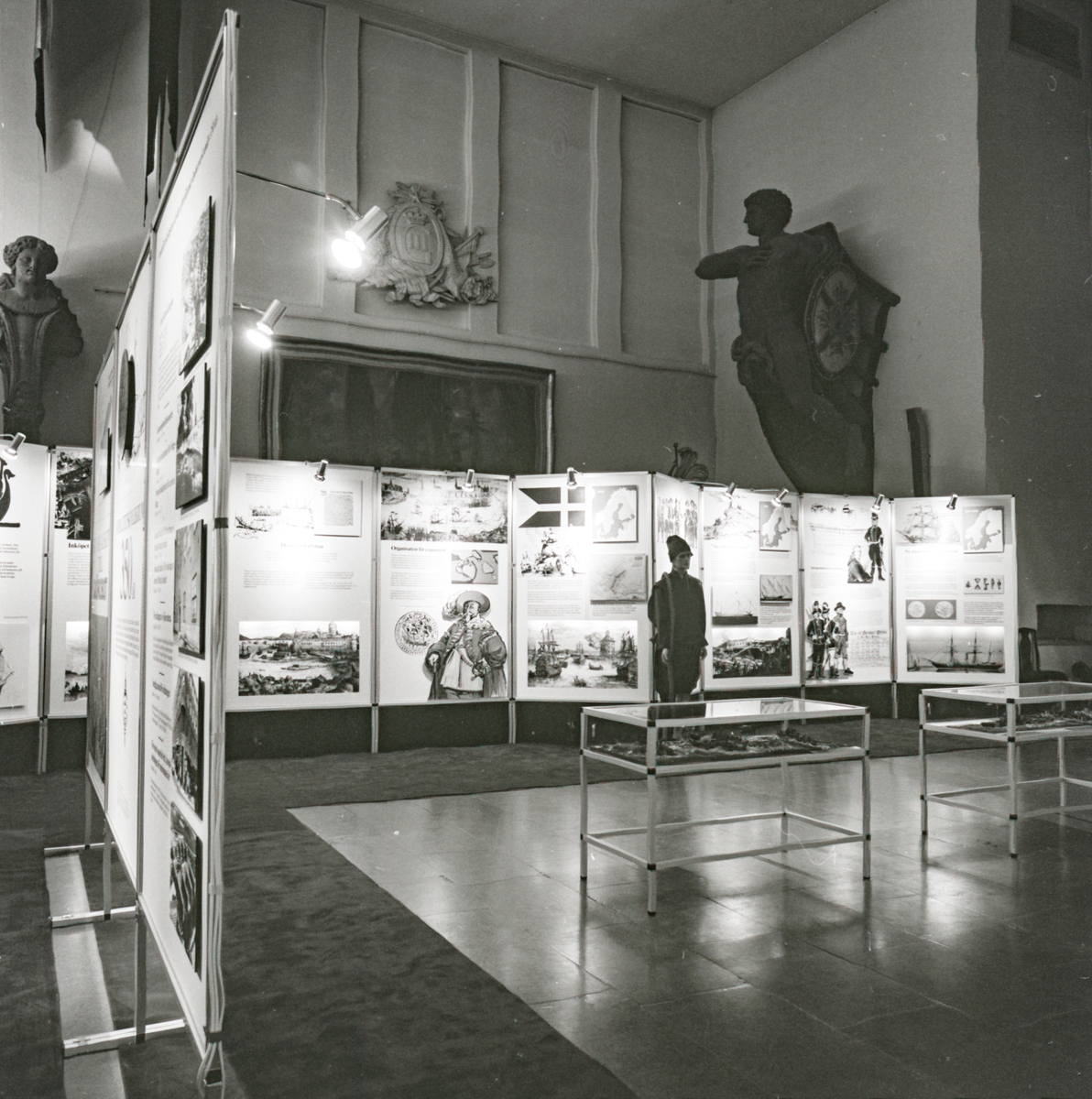Utställningen "Från regalskepp till sjörobot Amiralitetskollegium 350 år". Överblick av skärmutställning i Minneshallen.