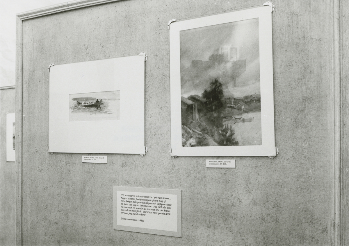 Utställningen "Anders Zorn vatten, båtar och skärgård". Två akvareller samt ett citat av konstnären på skärm.