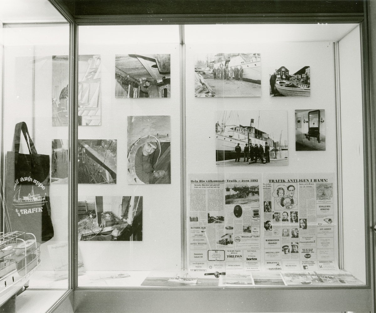 Utställningen "SS Trafik". Del av utställningen i trappmontern. Fotografier och artikel kopplade till SS Trafik.