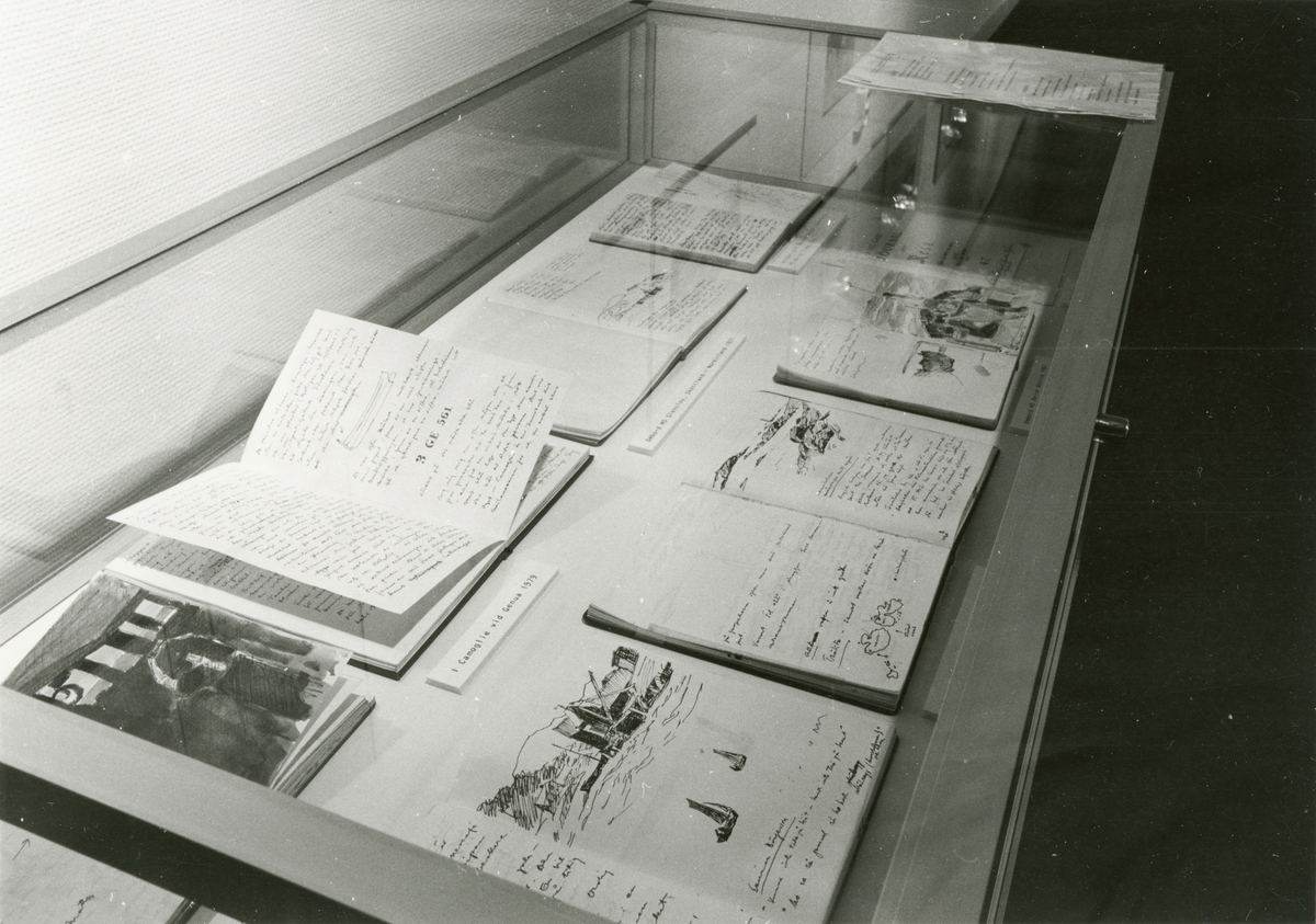 Utställningen "Akvareller och teckningar av Arne Gadd". Utställningsinteriör med bokmonter innehållande konstnärens anteckningsböcker.