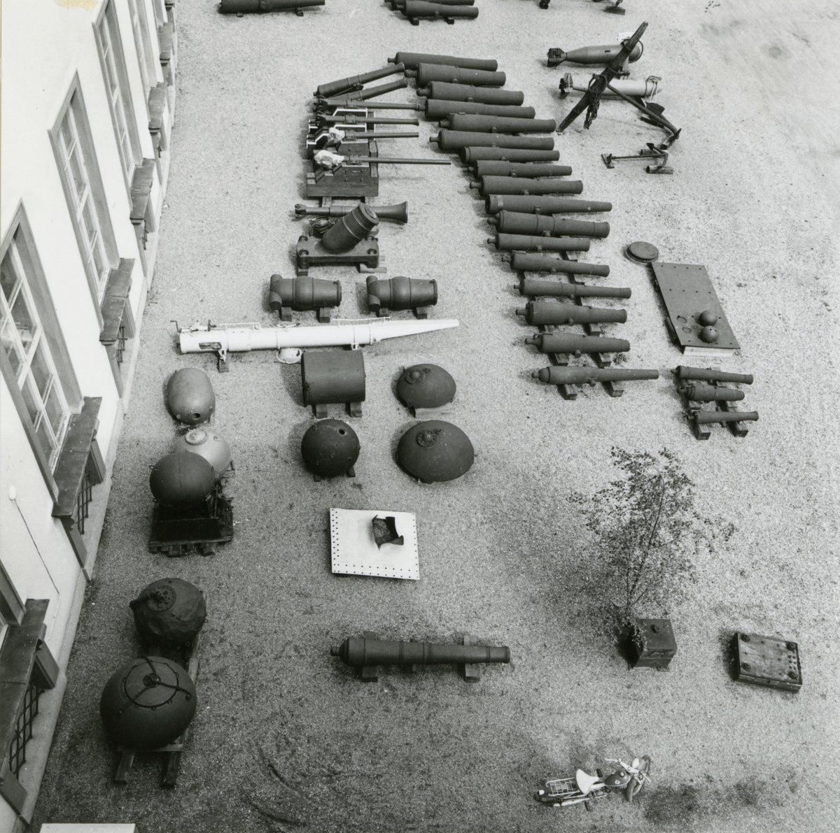 Utställning vid kanongården utanför Sjöhistoriska museets baksida. Kanoner, minor och en moped m.m.