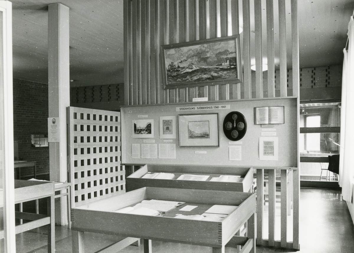 Utställningen "Stockholms Sjömanshus 17481961". Utställningsinteriör av monter och skärmvägg.