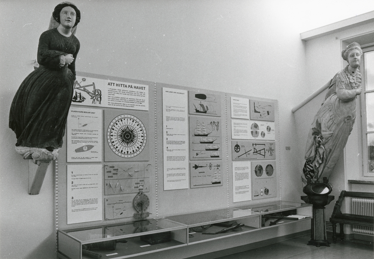 Basutställning i mastrummet i Sjöfartsavdelningen. Utställningsinteriör om navigation med titel "Att hitta på havet". Illustrationer och föremål kopplat till navigering.