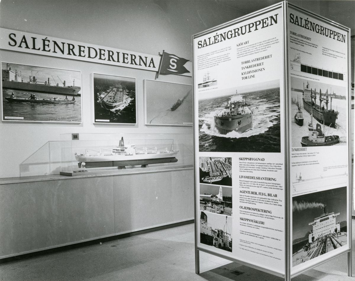 Basutställning i Sjöfartsavdelningen, Rederisalen. Saléngruppens monter. Utställningsinteriör med fartygsmodell, texter och fotografier.
