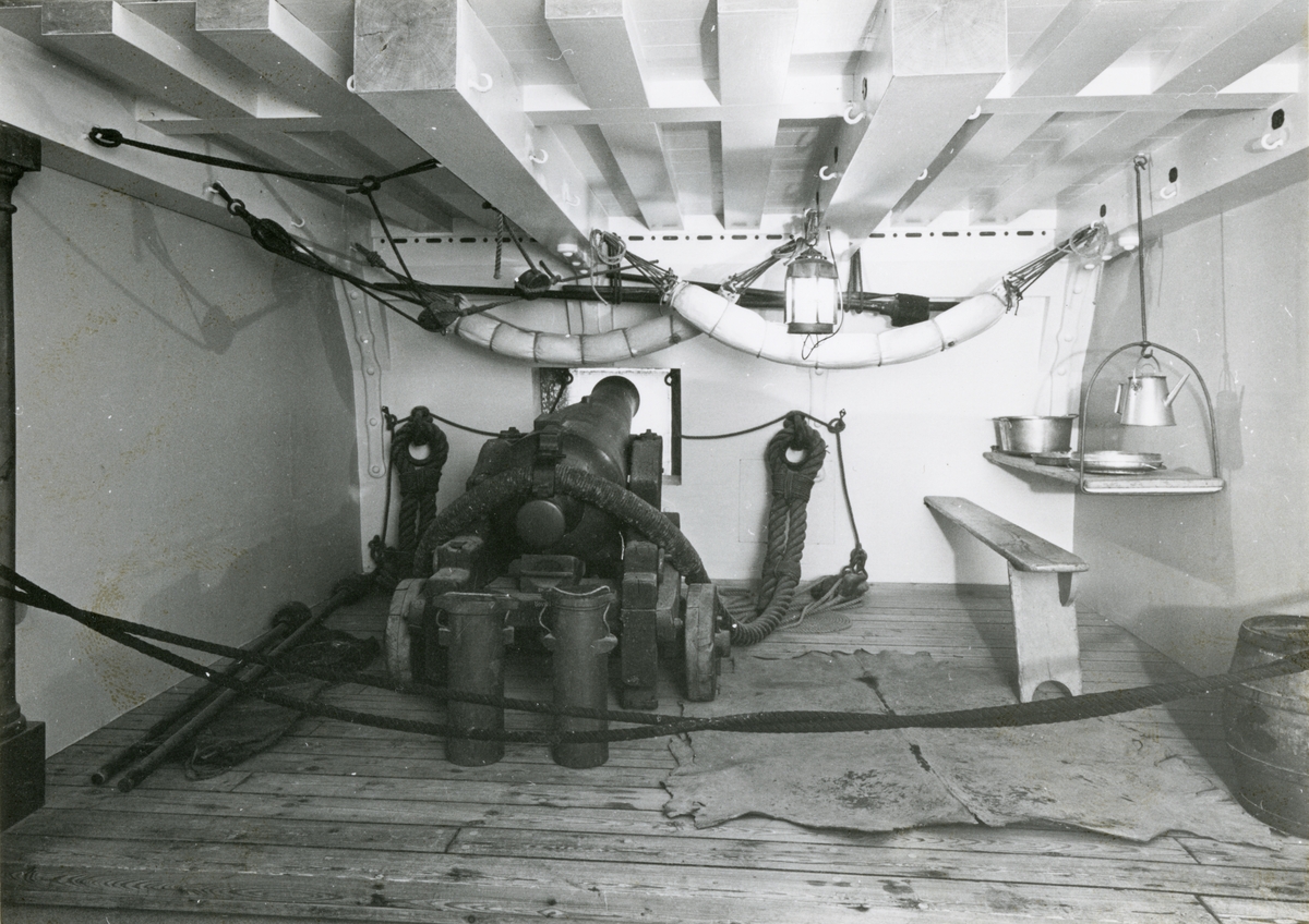 Utställning i Örlogsavdelningen, rum 7, Batterirumet. Östra väggen. Kanon med lavett på batteridäck.