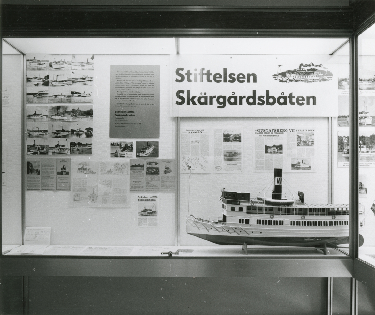 Utställningen "Skärgårdsbåtarna". Trappmonter med montage av fotografier och artiklar om Föreningen Stiftelsen Skärgårdsbåten samt en fartygsmodell av SAXAREN.