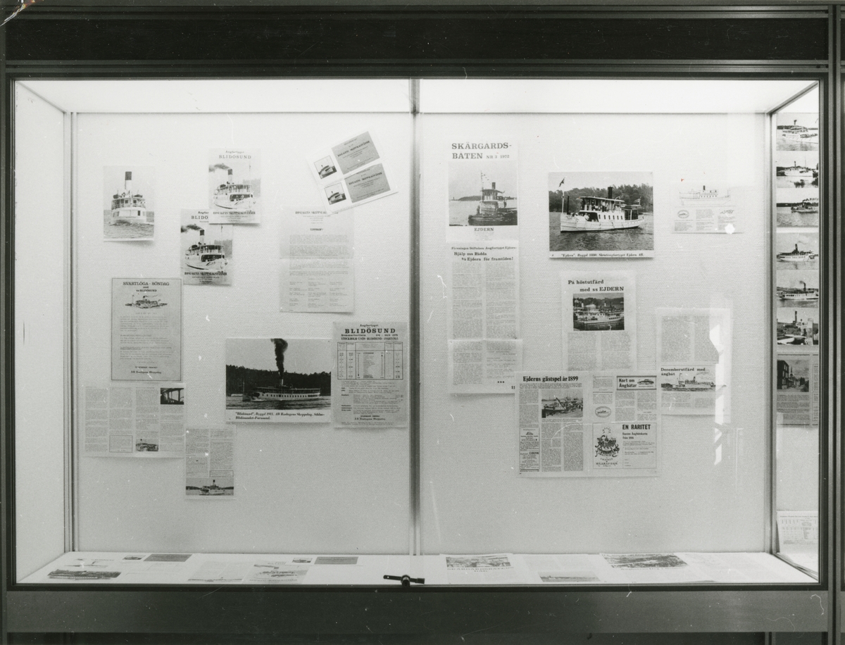 Utställningen "Skärgårdsbåtarna". Trappmonter med montage av artiklar om Föreningen Stiftelsen Skärgårdsbåten.