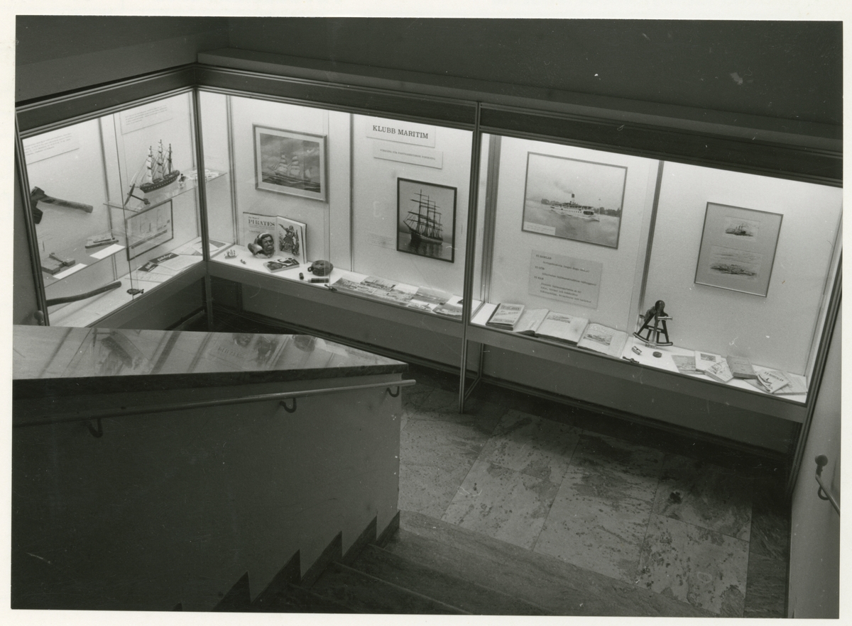 Utställningen "Klubb Maritim". Överblick av trappmoter med presentation av Klubb Maritim, Föreningen för fartygsforskning. Arkivalier, konst och föremål.