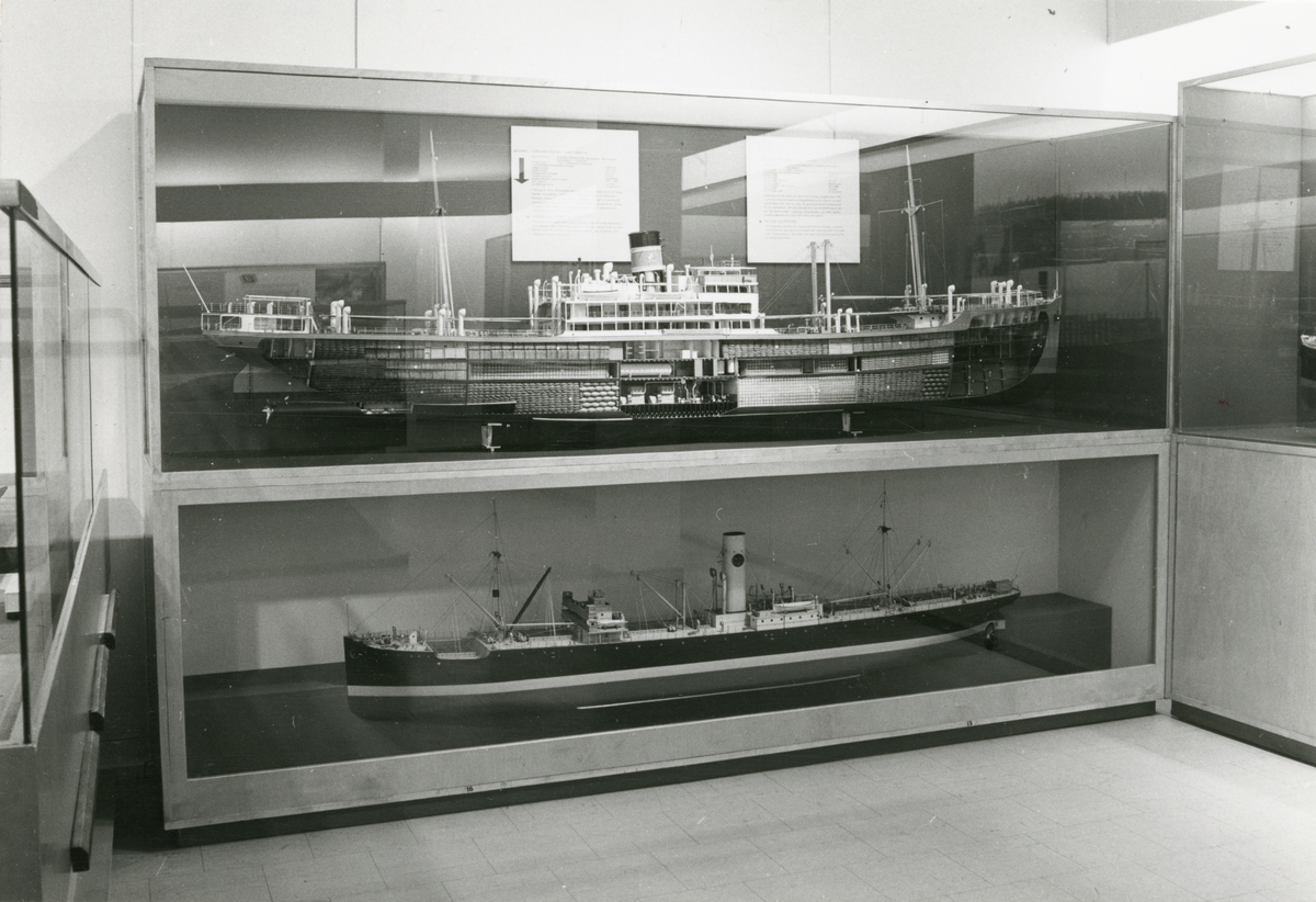Utställningen i Rederisalen. Tillfällig uppställning av en del i rederisalsmaterialet. Två fartygsmodeller av lastmotorfartyg.