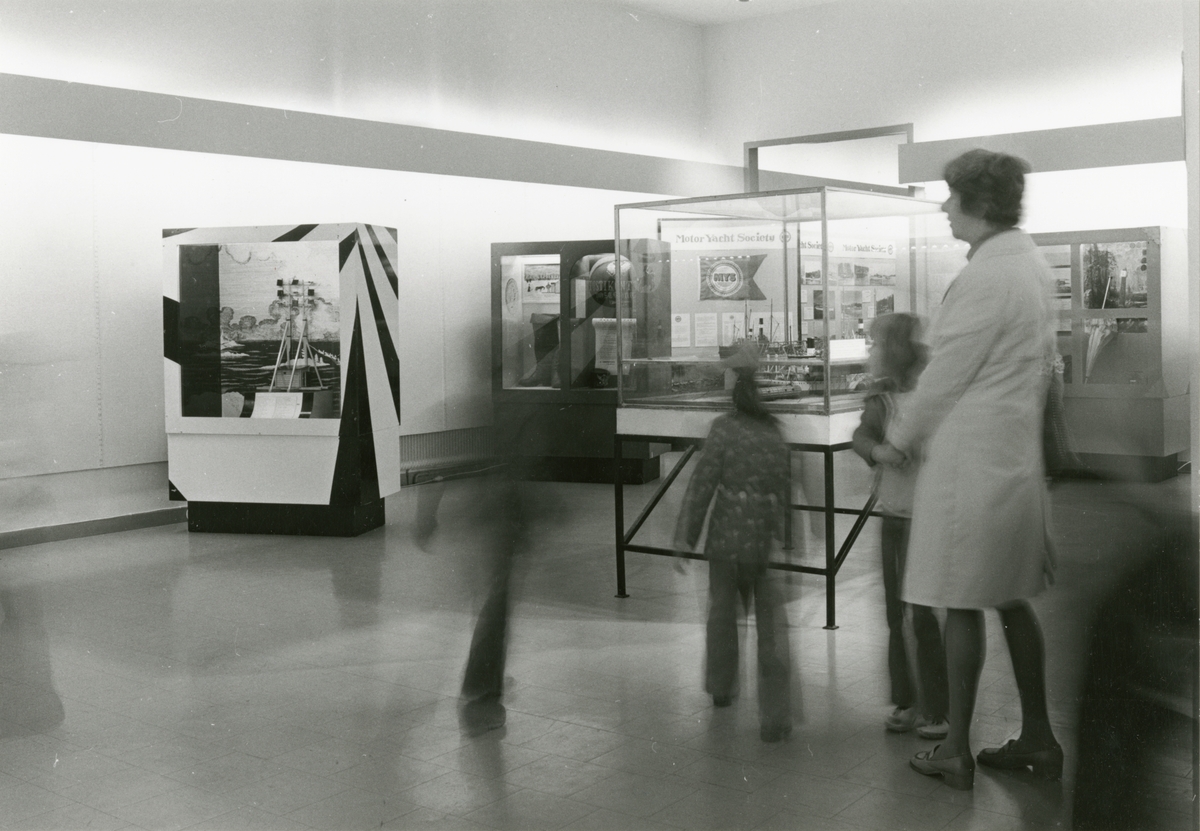 Utställningen "Post över Ålands hav". En kvinna besöker utställningen. På bilden synns även fyra barn i rörelseokärpa.