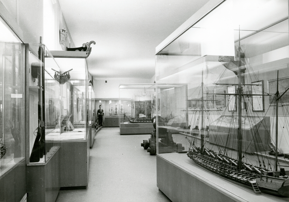 Utställning i Örlogsavdelningen. Överblick av utställningsinteriör med fartygsmodeller, vapen, uniform m.m. I förgrunden t h modell av udema INGEBORG.