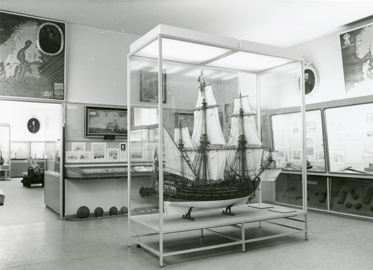 Utställning i Örlogsavdelningen. Överblick av utställningsinteriör med fartygsmodell m.m.