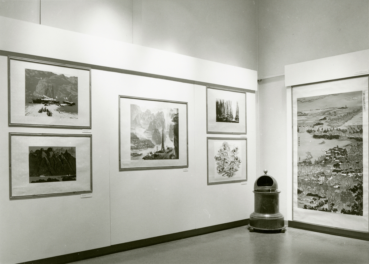 Utställningen "Fjorton kinesiska träsnitt från Anhuiprovinsen". Del av utställningen. Utställda träsnitt med kinesiska motiv.