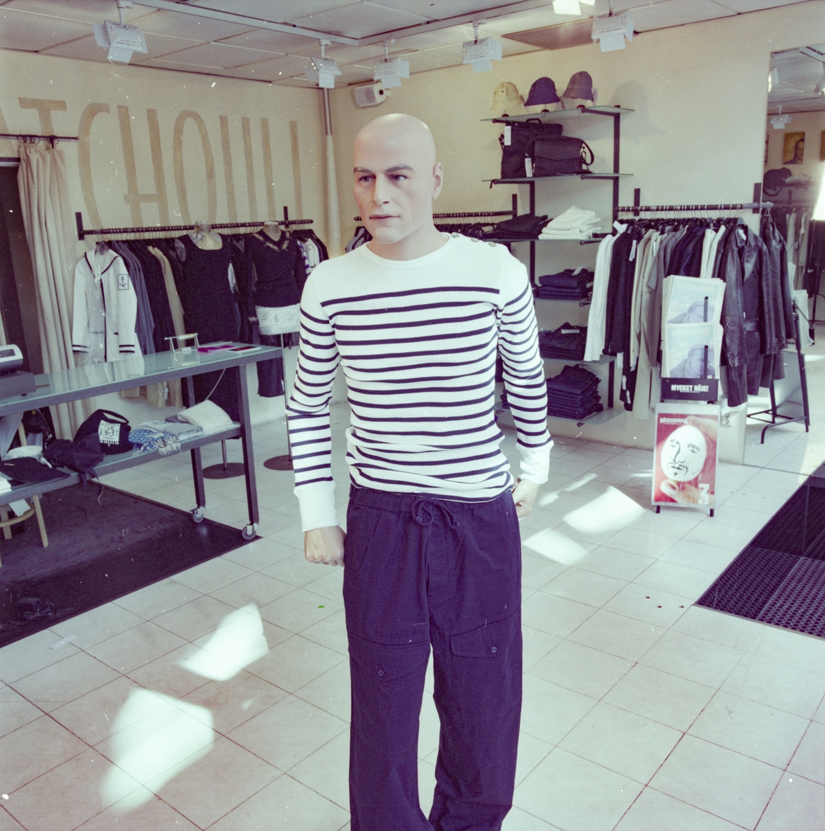 I samband med utställningen "Sjömanskostymen". Jean-Paul Gaultier-kläder på en skyldocka i butik.