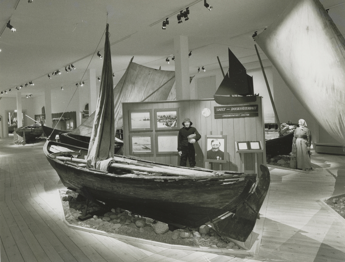 Utställningen "Människor och båtar i Norden". Utställningsinteriör med orginalbåt.