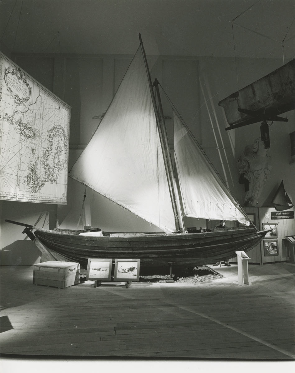 Utställningen "Människor och båtar i Norden". Utställningsinteriör med orginalbåt.