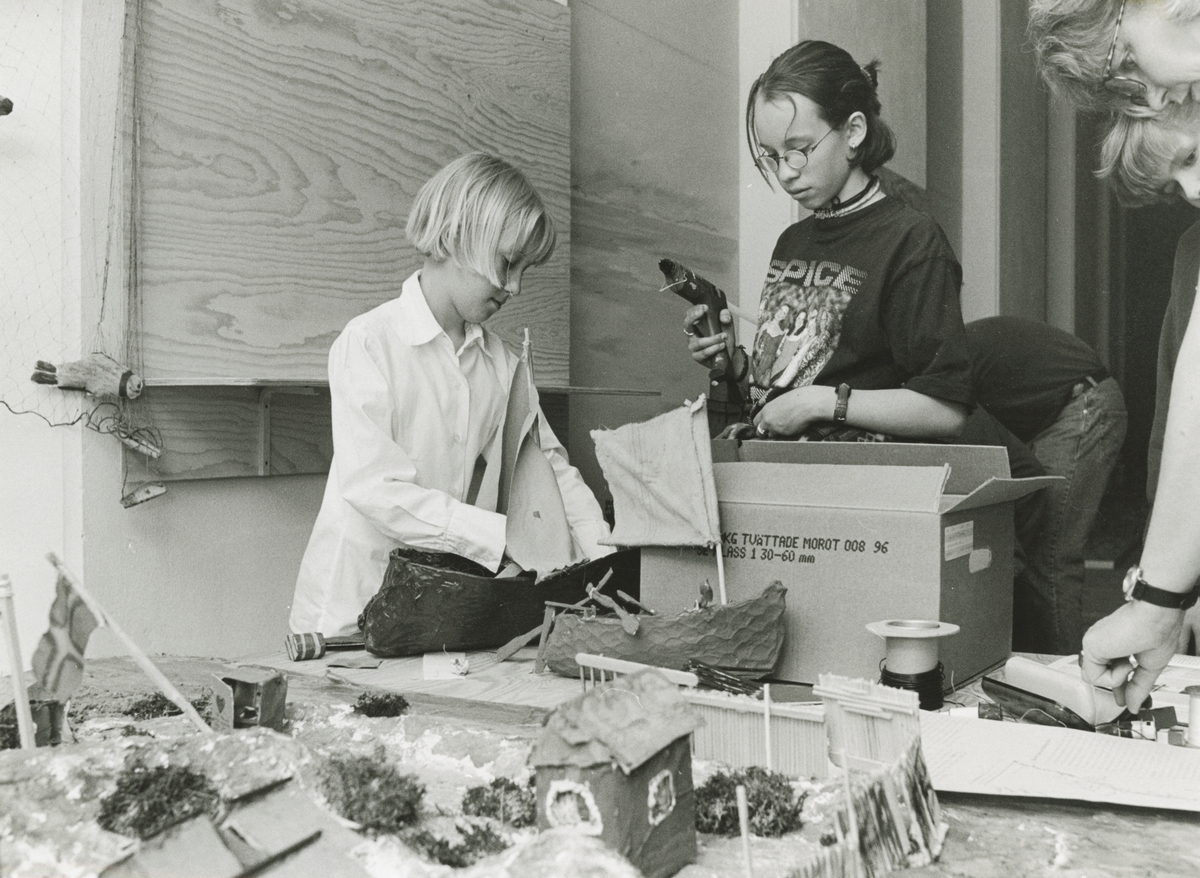 Två flickor skapar båtar i skaparverkstaden på Sjöhistoriska museet.