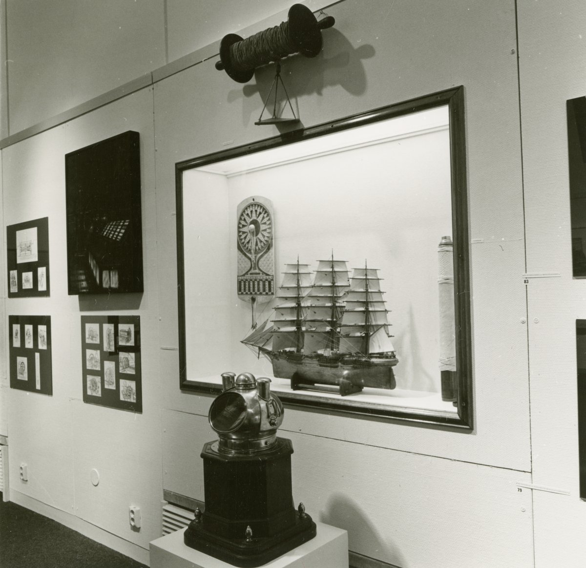 Utställningen "Under segel Björn Senneby". Del av utställningen med skisser samt fartygsmodell och navigationsredskap.