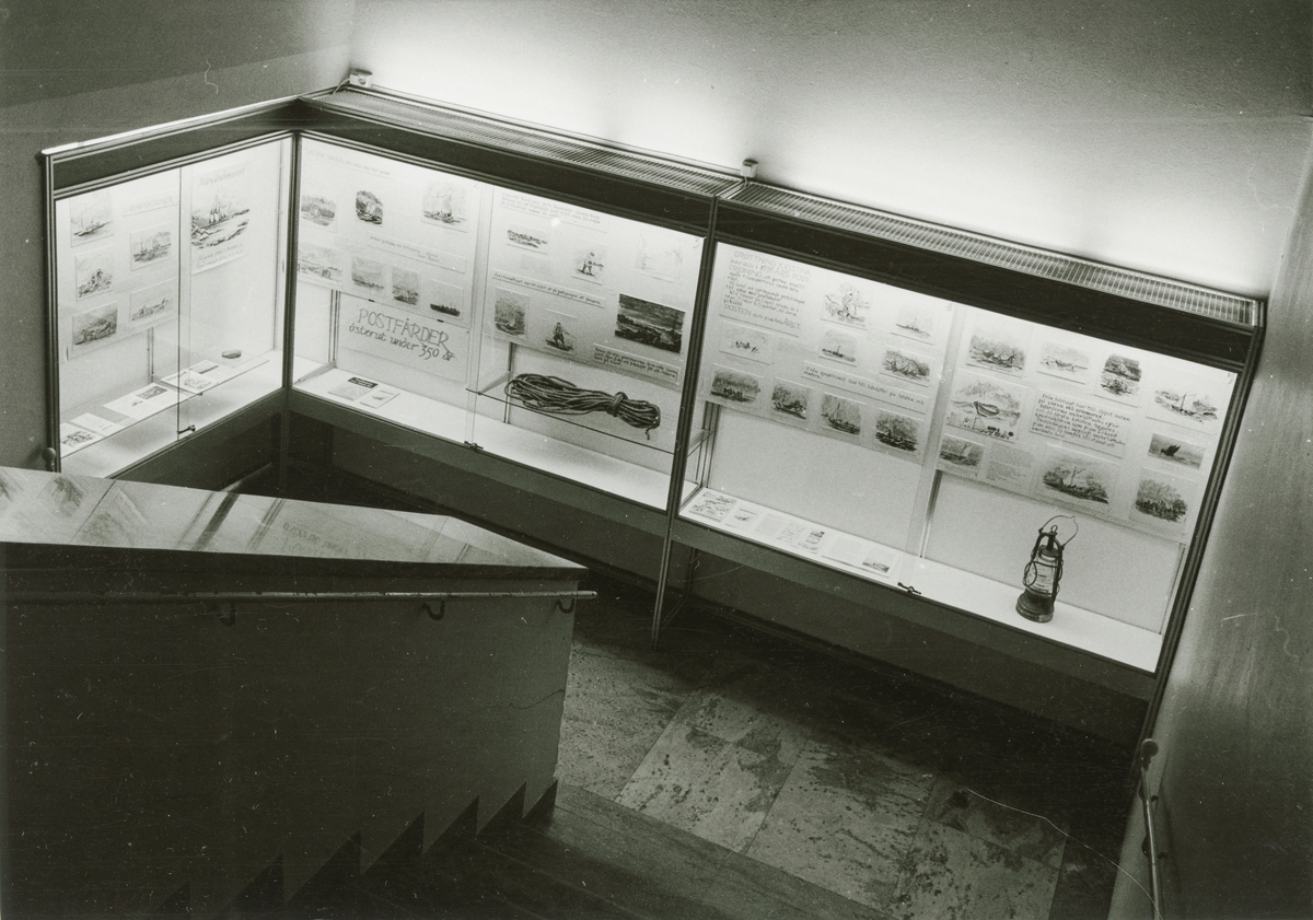 Utställningen "Postfärder under 350 år" i norra trappmontern. Illustrationer och berättelser.