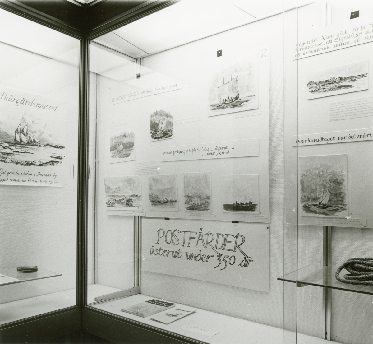 Utställningen "Postfärder under 350 år" i norra trappmontern. Illustrationer och berättelser.