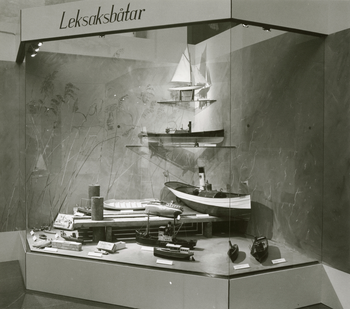 Utställningen "Modellutställningen" i Minneshallen. Monter visande leksaksbåtar.