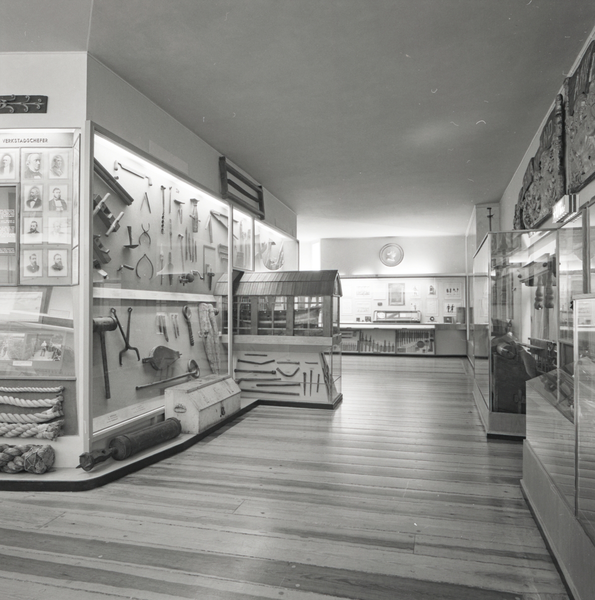 Skeppsbyggeriutställningen. Överblicksbild vid montern visandes verktyg använda vid skeppsbyggeri.