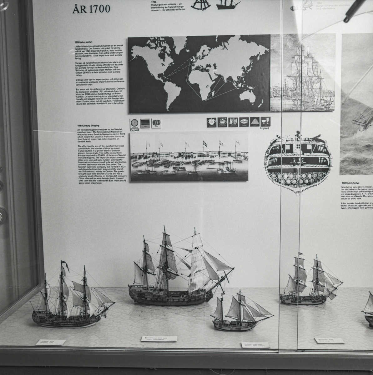Utställningen "Skutor" i runda rummet. Monter om 1700-talets sjöfart med mindre fartygsmodeller.