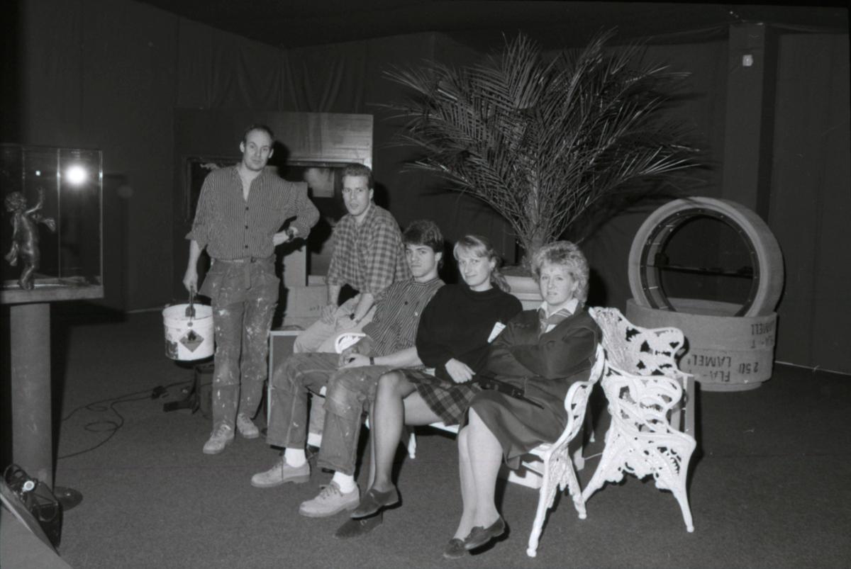 Utställningen "Titanics skatter". Sjöhistoriska museets personal under arbetet med utställningen. Gruppbild. Magnus Faxén (rustmästare), Stefan Bruhn (modellbyggare), Peter Dans (tekniker) samt en extern vakt och troligen utställningsproducenten.